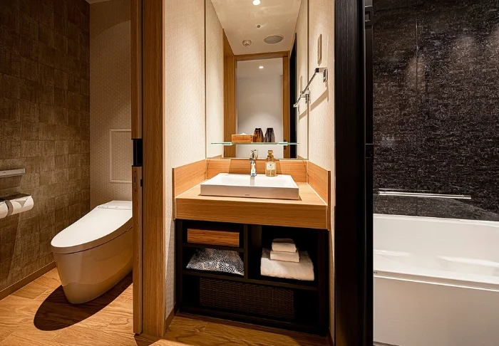 U verblijft in een Standaardkamer met warme verlichting en een harmonieuze kleurencombinatie. Het op maat gemaakte bed biedt extra comfort, en de badkamer beschikt over een aparte douche, wastafel en toilet. Verder zijn er voorzieningen zoals airconditioning, wifi, TV, een minibar, waterkoker met Japans theeservies, kluisje, föhn en een zorgvuldig geselecteerde set toiletartikelen. Ook liggen er een yukata-badjas en slippers voor u klaar.