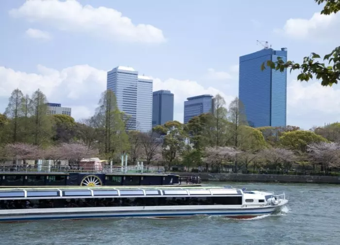 Van kasteel Osaka is het een klein stukje lopen naar de rivier. Hier stapt u aan boord van de Aqualiner-boot voor een sightseeing-boottocht op de waterwegen van Osaka.