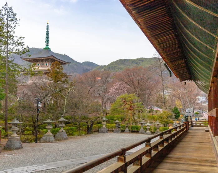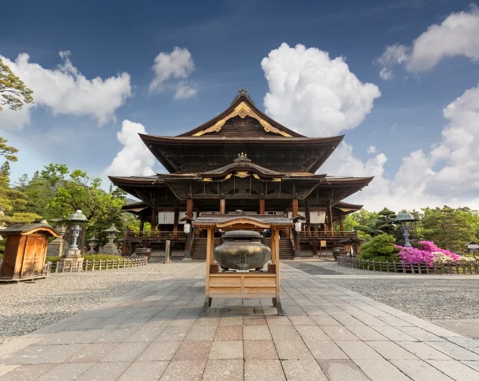 Een goed beginpunt is een wandeling naar Zenko-ji, een van de oudste en belangrijkste tempels van Japan. Wandel over de brede laan die naar het tempelcomplex leidt, met aan weerszijden kleine winkeltjes waar wierook, handgemaakte souvenirs en lokale lekkernijen worden verkocht. In de indrukwekkende houten hoofdzaal heerst een serene sfeer van stille devotie, slechts onderbroken door zachte gebeden en de zoete, zware geur van wierook. Rondom de tempel kunt u door smalle zijstraatjes dwalen vol cafés en kleine winkeltjes, waar het dagelijkse leven rustig zijn gang gaat. U kunt de wandeling vervolgen naar Joyama Park, waar de slingerende paden door groene open ruimtes voeren en een prachtig uitzicht op de bergen bieden.