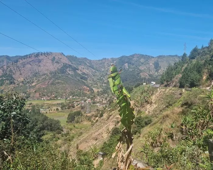 Na een paar uur rijden door een heuvelachtig plateaulandschap met veel rijstvelden verandert het landschap. De heuvels worden hoger en de bossen dichter. Hier en daar kun je een glimp opvangen van de rivier onder in het dal.
