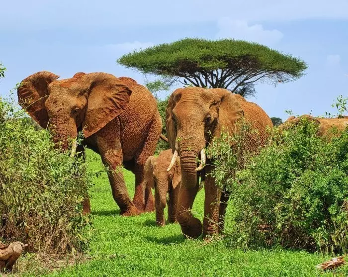 In Tsavo East heeft de grond een helderrode kleur, waardoor de wilde dieren een nogal opvallend roodachtig uiterlijk krijgen. Je kunt maar beter wennen aan de rode aarde – die kom je weer tegen als je in Madagaskar aankomt.