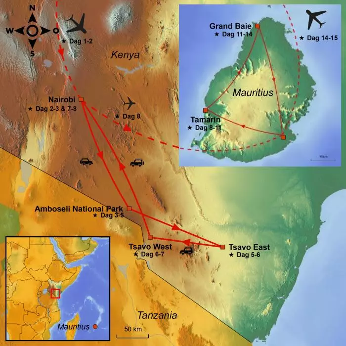 Je landt op de luchthaven van je keuze na een avontuurlijke rondreis door Kenia en Mauritius.