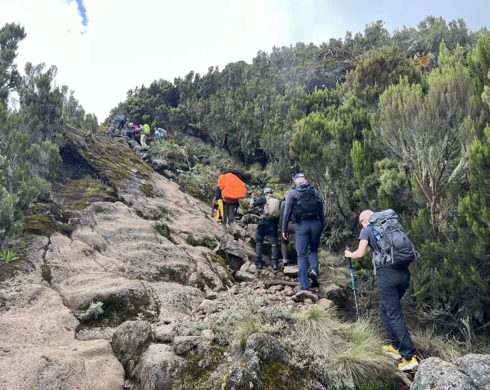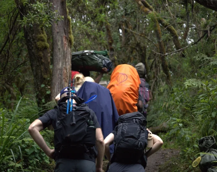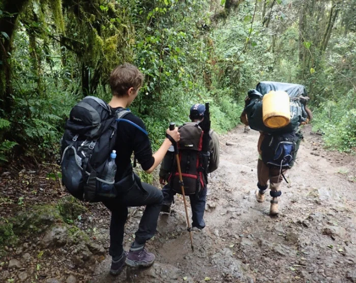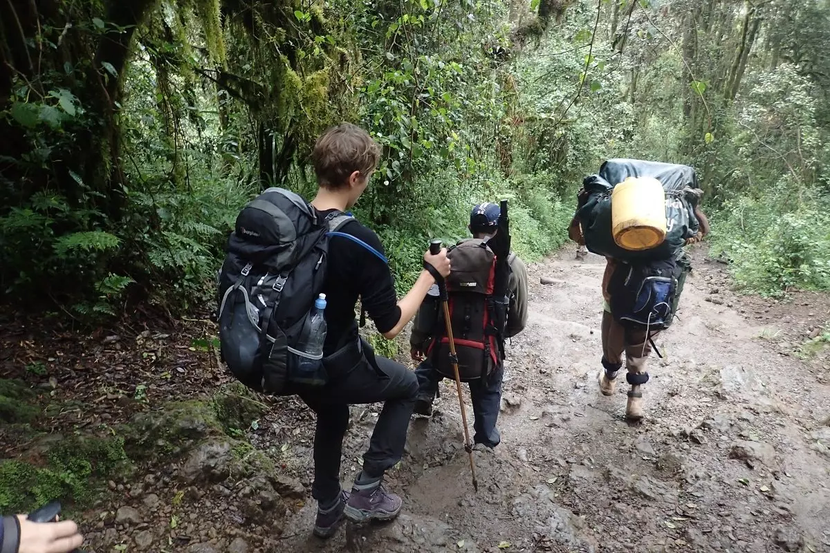 Het eerste traject van de tocht op lage hoogte kan nat en modderig zijn. U loopt via mooie paden door het dichte regenwoud, waar u mogelijk dieren ziet als de zeer fraaie en zeldzame zwart-witte colobusapen. De dragers lopen vooruit en zorgen ervoor dat uw tent klaarstaat als u bij het Machame Camp aankomt.
