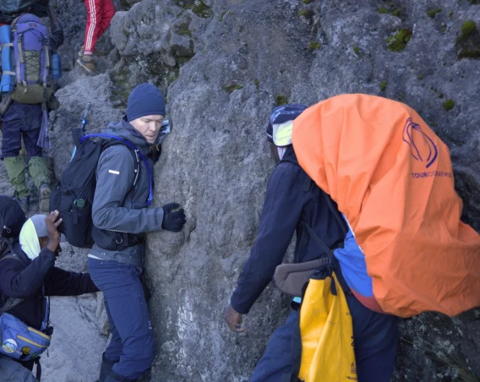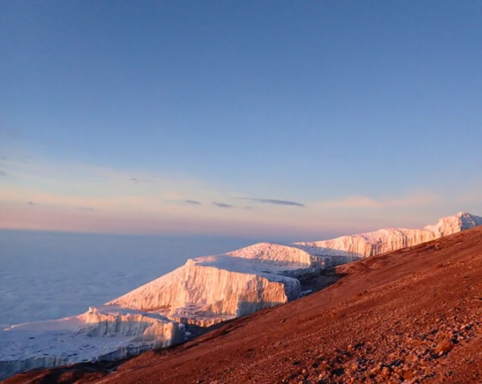 Na een nacht onder de indrukwekkende Great Barranco Wall en een stevig ontbijt, beklimt u de beruchte rotswand. Dit is gelukkig minder moeilijk dan het lijkt. Op de top onder de Heim-gletsjer, die als een enorm ijsgordijn boven het massief hangt, zult u getroffen worden door de adembenemende schoonheid van de Kilimanjaro.