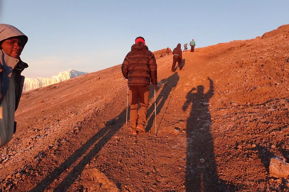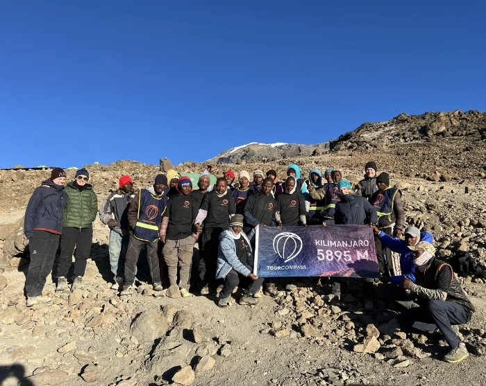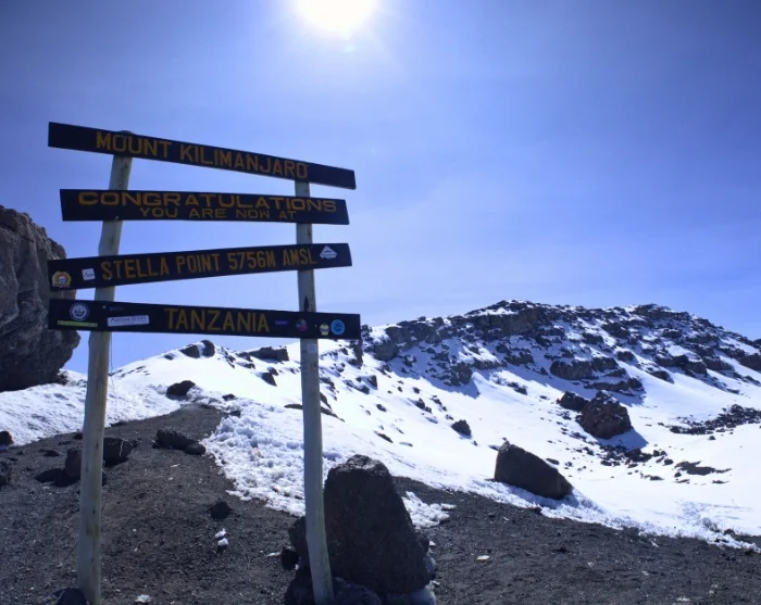 Rond middernacht staat u op en krijgt u een snack geserveerd voordat u in het donker begint aan de laatste klim naar de top. Het moeilijke terrein tijdens de ca. 6 uur naar Stella Point is voor de meeste mensen de grootste uitdaging. Het doel is Stella Point kort na zonsopgang te bereiken, zodat u hier kunt genieten van dit roodgloeiende schouwspel. We pauzeren niet lang, omdat het anders bijna onmogelijk wordt om weer op gang te komen als gevolg van de kou en de vermoeidheid. U loopt verder langs de kraterrand, met aan het eind een gelijkmatige stijging. Afhankelijk van het seizoen ligt er mogelijk sneeuw op het laatste traject voor de eindbestemming: de Uhuru Peak, de top van de Kilimanjaro en de top van Afrika. Als u de top heeft bereikt op 5.895 m hoogte, kunt u uzelf een schouderklopje geven, genieten van het fantastische uitzicht en ter herinnering een selfie maken bij het Uhuru Peak-bord.