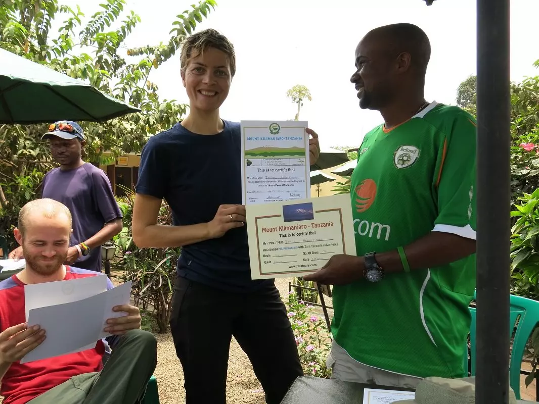 De laatste etappe is een gemakkelijke wandeltocht van 3 uur door het Nationaale Park naar de Mweka Gate. Hier checkt u uit, waarna u wordt teruggereden naar het dorp Moshi. In het hotel wacht u een heerlijke lunch en een – langverwacht – zalig warm bad. Iedereen die de klim heeft volbracht, krijgt een diploma uitgereikt.