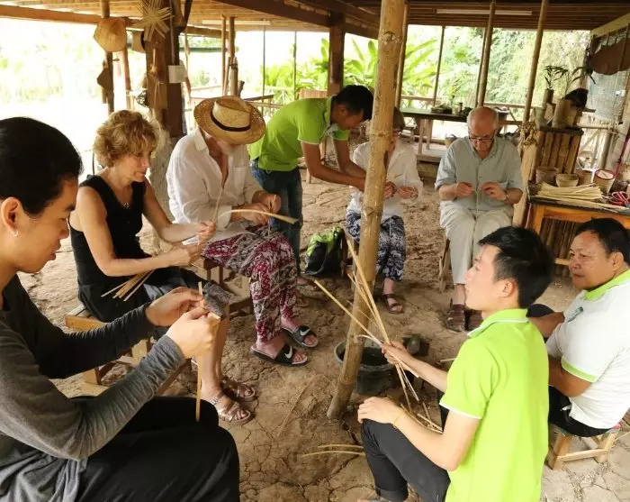Je wordt opgehaald bij het hotel; de rit duurt maar 12 minuten. Bij aankomst word je verwelkomd en terwijl je van je welkomstdrankje nipt, krijg je een inleiding op het belang van de bamboeplant voor de Laotiaanse cultuur. Daarna zijn er activiteiten zoals op bamboestelten lopen en bamboeboogschieten.