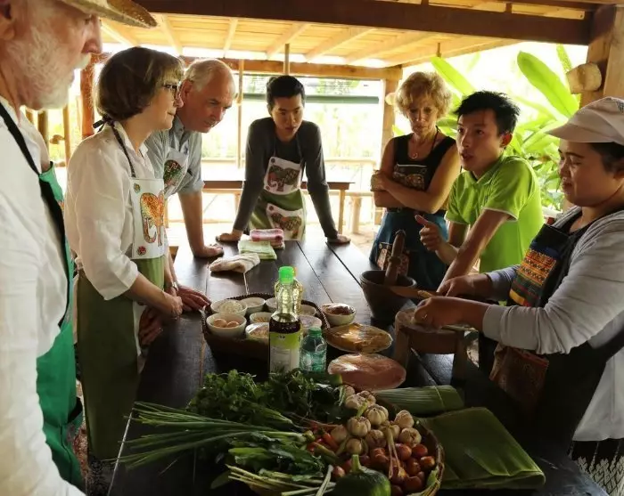Daarna krijg je een interessante kookles, waarin je leert hoe je Laotische gerechten kunt bereiden met bamboescheuten als hoofdingrediënt. Je leert hoe je bamboescheutensoep, gestoomde bamboescheuten in bananenbladeren, bamboedip enz. maakt. Tot slot kun je genieten van je zelfbereide maaltijd, die uiteraard op een bamboeschaal wordt geserveerd.