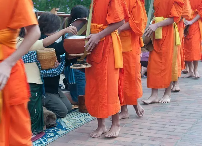 In de vroege ochtenduren bij het luiden van de tempelklokken, zult u getuige zijn van iets heel bijzonders in Luang Prabang. In de frisse ochtendlucht gaat een processie van meer dan 300 monniken elke ochtend in stilte door de straten om rijst en ander voedsel te verzamelen; aalmoezen die ze krijgen van de plaatselijke bevolking in hun karakteristieke bronzen kommen. Het ritueel is een traditie waarbij de monniken om voedsel vragen om hun nederigheid te tonen. Aalmoezen vragen is een belangrijke religieuze handeling in het boeddhisme en moet respectvol worden beantwoord door zowel de plaatselijke inwoners als de toeristen. Als u graag een aalmoes wilt geven, zal de gids u laten zien hoe u dit het beste kunt doen.