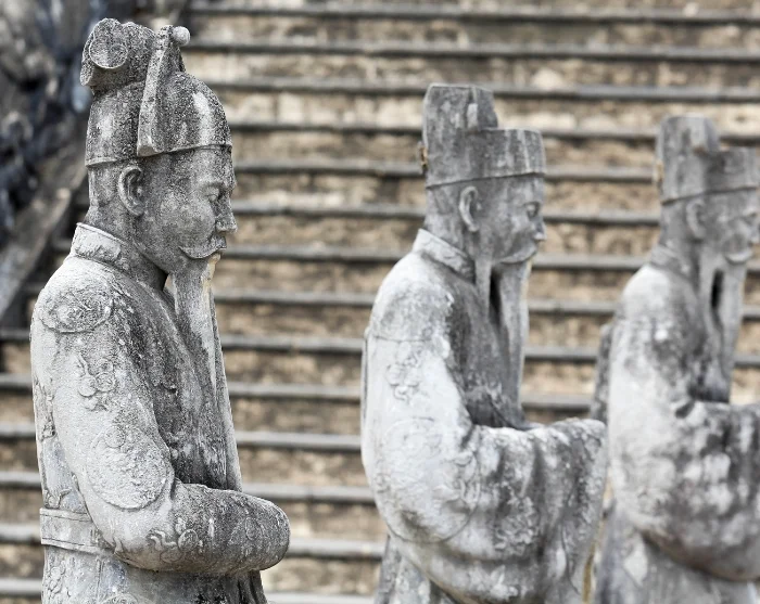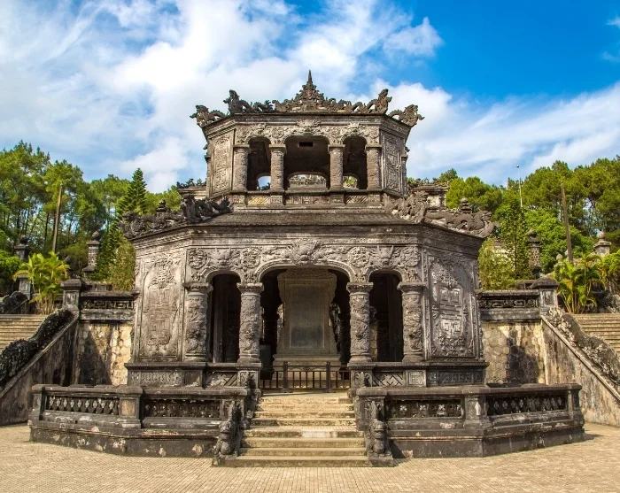 Daarna bezoekt u het graf van Keizer Khai Dinh, die zich duidelijk onderscheidt van de andere keizerlijke graven in deze regio. Dit complex, gebouwd in het begin van de 20e eeuw, vormt een unieke mix van traditionele Vietnamese elementen met Europese barokke en gotische invloeden. Het resultaat is een architectonisch meesterwerk: groots opgezet, vol verfijnde details, een eerbetoon aan de keizer én een weerspiegeling van zijn fascinatie voor westerse kunst en cultuur.
