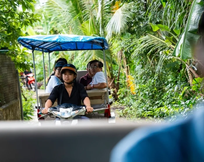 Uw boottocht voert u verder naar een rustig eiland midden in de Mekong, waar u geniet van een Vietnamese lunch die is bereid met verse, lokale ingrediënten. U zit hier te midden van weelderig groen en ervaart het kalme ritme van het leven langs de rivier.