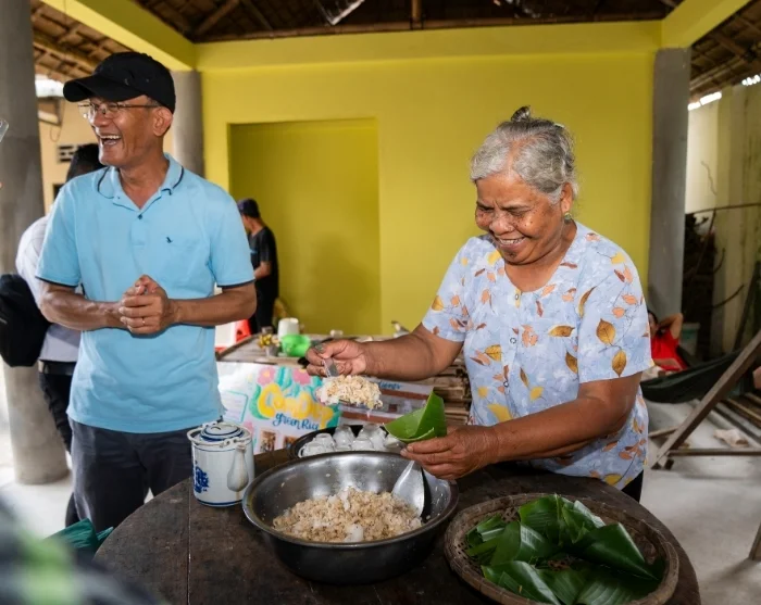 Daarna rijdt de tuk tuk verder door de rustige straatjes van het dorp. De eerste stop is bij een lokale familie thuis, waar u com dep (groene rijstvlokken) proeft en ziet hoe gepofte rijst wordt gemaakt.