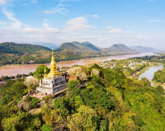 Vervolgens brengt de reis u naar Mount Phousi, slechts een kilometer verderop. Hier leiden 328 treden u naar de top. Onderweg passeert u kleine tempels en Boeddhabeelden en kunt u geregeld even pauzeren om de omgeving in u op te nemen. Eenmaal boven wacht u een betoverend panoramisch uitzicht over Luang Prabang; de rivieren, tempels en het weelderige landschap zijn prachtig omlijst door groene bergen.
