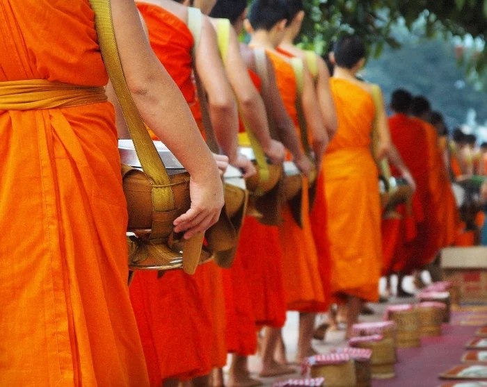 Elke ochtend, in de vroege uren, speelt zich in Luang Prabang een bijzonder tafereel af. Honderden monniken bewegen zich in stilte door de straten van de stad om aalmoezen op te halen. Uit elk gezin komt iemand naar buiten met eten of drinken dat in de kommen van de monniken wordt gelegd. Het is moeilijk om niet geraakt te worden door de respectvolle stilte en het enorme gevoel van waardigheid waarmee dit dagelijkse ritueel gepaard gaat.