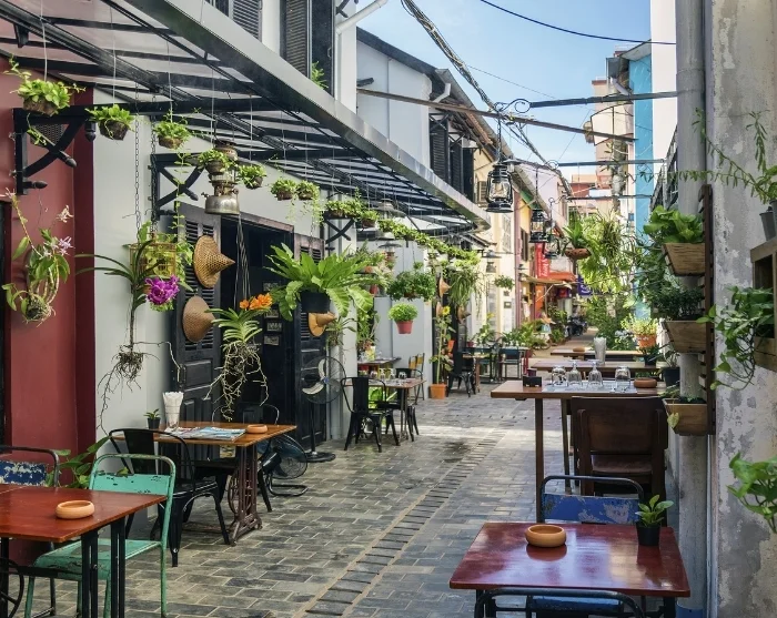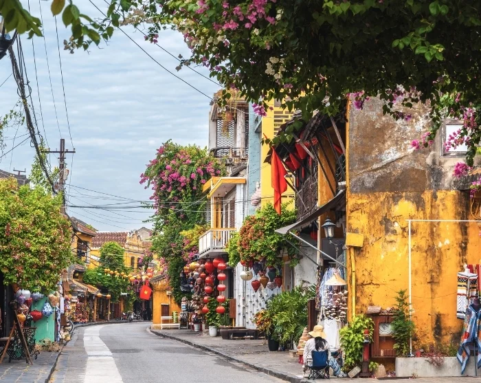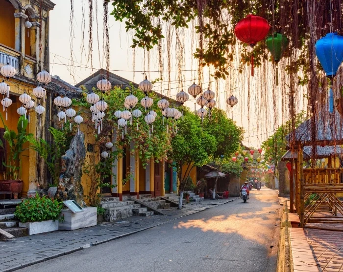 Ver weg van de rivier ontvouwt zich een sfeervol doolhof van smalle straatjes. Hier vindt u een levendige mix van Japanse houten huizen, Chinese vergaderzalen, elegante Franse koloniale panden en iconische koopmanswoningen. Kleurrijke lantaarns hangen als guirlandes over de straten en zorgen, vooral bij het vallen van de avond, voor een betoverende sfeer. Winkeltjes, kraampjes met streetfood, knusse cafés en uitnodigende kleine restaurants rijgen zich als parels aaneen, zodat u op uw gemak kunt ontspannen of nieuwsgierig nieuwe ontdekkingen kunt doen.