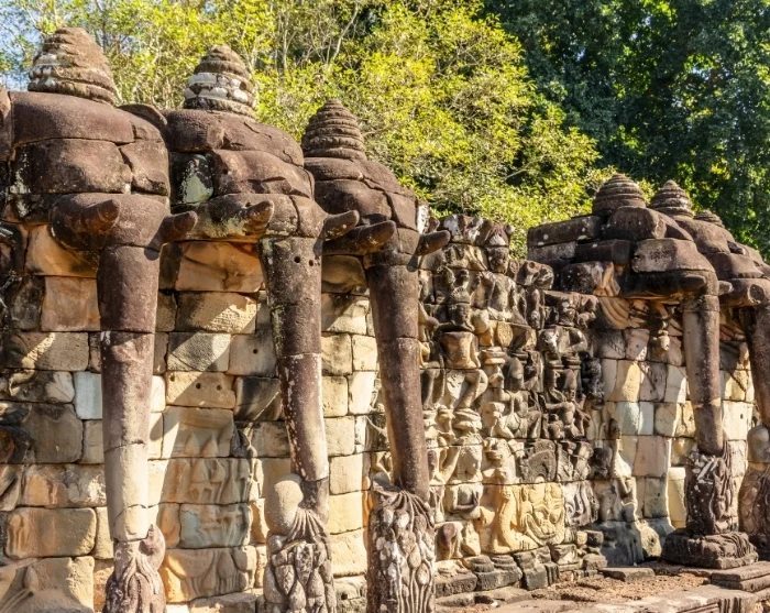 Ontdek het Olifantenterras, waar een lange muur versierd is met prachtig gebeeldhouwde olifantskoppen. Vanaf deze plek kon koning Jayavarman vroeger zijn leger gadeslaan. In de buurt ligt het Terras van de Leprakonig, met een standbeeld van Yama, de hindoegod van de dood.