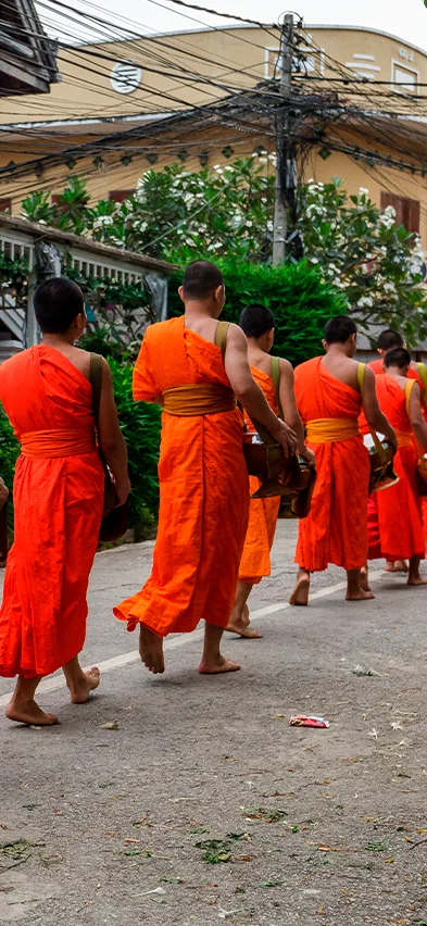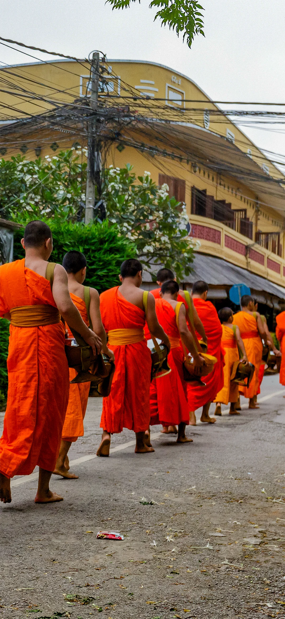 Elke ochtend, vroeg in de ochtenduren, vindt er in Luang Prabang een bijzonder ritueel plaats. Honderden monniken trekken stillekens door de straten om aalmoezen op te halen. Elke familie stuurt iemand naar buiten met eten of drinken, dat vervolgens in de schalen van de monniken wordt gedaan. De indrukwekkende stilte en het diepe respect waarmee dit dagelijks gebeurt, laten niemand onberoerd.