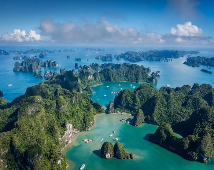 De Ha Long baai behoort tot de meest markante natuurgebieden van Vietnam. Hier rijzen honderden met groen begroeide kalkstenen rotspilaren imposant op uit zee, die gedurende het jaar kleurt van diepblauw tot jadegroen. Het grootste eiland, Cat Ba, herbergt diverse dorpen, terwijl enkele kleinere eilanden piepkleine vissersgemeenschappen kennen. Voor reizigers is de Ha Long baai vooral een natuurwonder van wereldformaat; voor de Vietnamezen is het bovendien een plek vol drakensagen en heldenverhalen. Het gebied beslaat zo’n 1.500 vierkante kilometer en staat sinds 1994 op de UNESCO-werelderfgoedlijst.