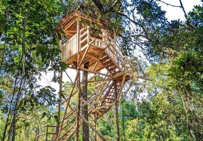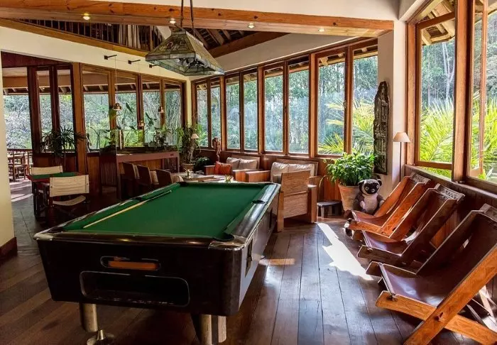 De lodge is gebouwd op een heuvel, dus je hebt een prachtig uitzicht vanuit het zwembad. Voor je ligt het regenwoud, dat niet zomaar een regenwoud is. Het is een origineel regenwoud uit de tijd dat alle continentale blokken van de aarde met elkaar verbonden waren en een supercontinent vormden.