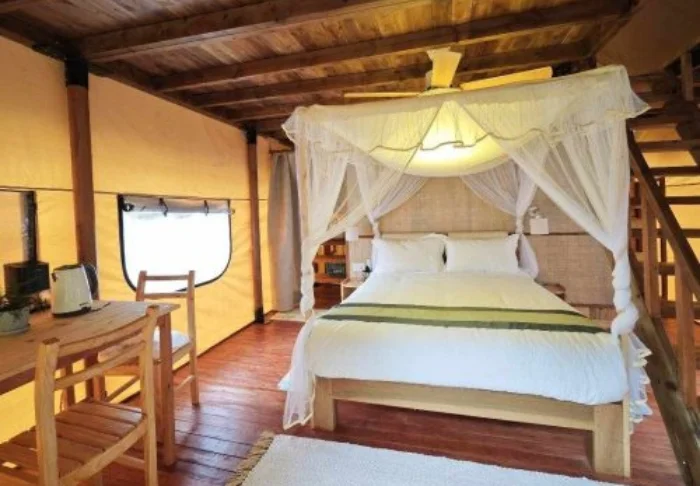 Er zijn zowel bungalows als luxe tenten, allemaal eenvoudig maar comfortabel ingericht, met houten accenten, muskietennetten en een klein terras – de perfecte plek voor een kopje koffie terwijl u luistert naar de geluiden van de jungle. U beschikt over warm water in de douche, de meeste tijd van de dag elektriciteit, en in de gemeenschappelijke ruimtes is er wifi beschikbaar.