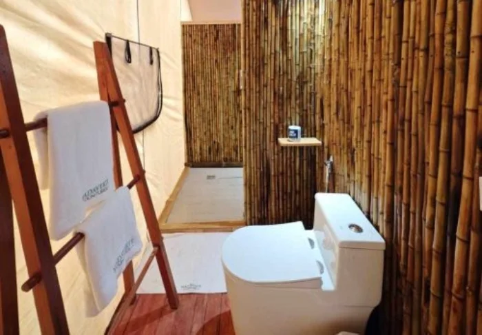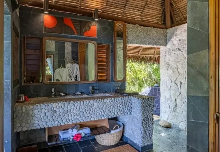 Alle bungalows zijn natuurlijk voorzien van een eigen badkamer, waarbij de douche buiten is, zodat je nooit ver van de natuur bent.