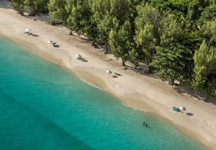 Weelderige vegetatie stroomt vanuit de berghellingen recht de zee in, enkel gescheiden door een ongerept wit zandstrand.
