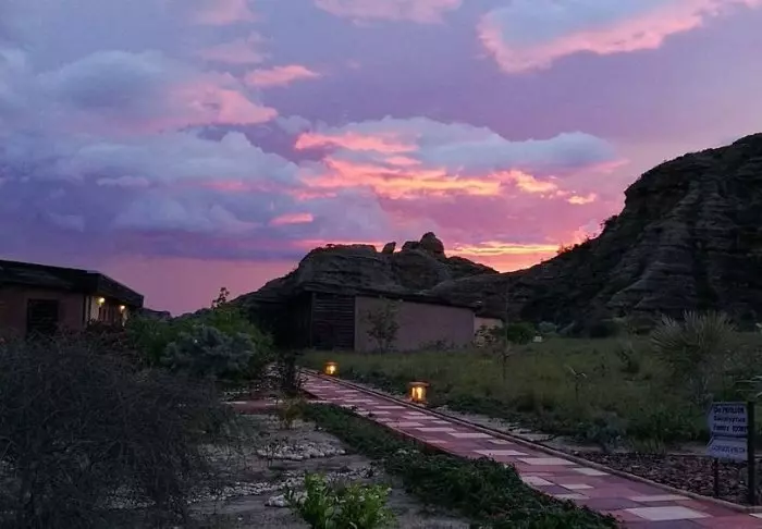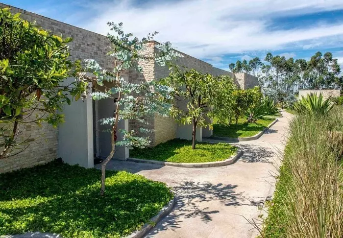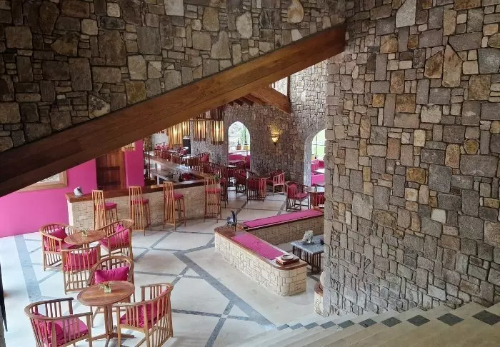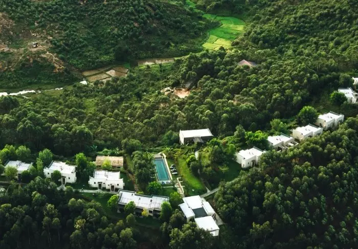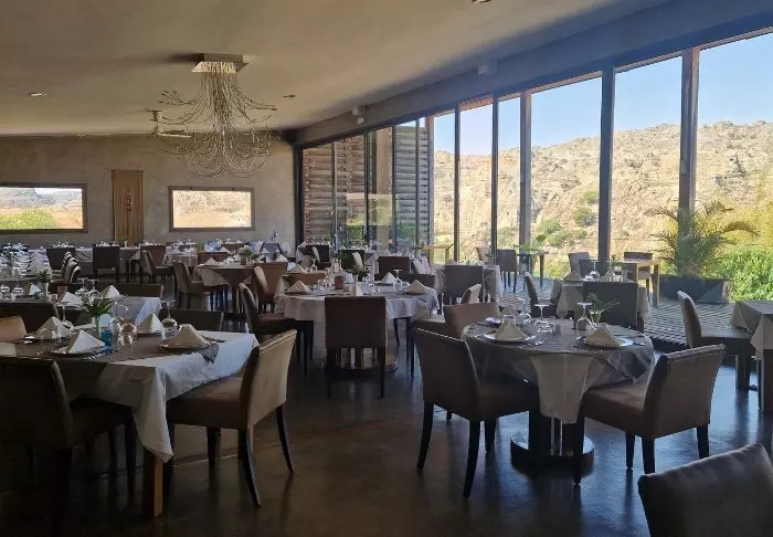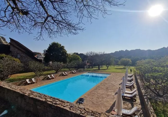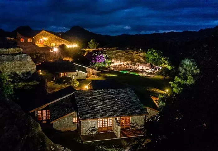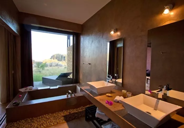Het hotel heeft 40 kamers en is gebouwd van graniet zodat het zoveel mogelijk opgaat in de omgeving. De kamers zijn gebouwd rond het grote centrale grasveld, met zandstenen rotsen aan één kant. Hier is er licht en frisse lucht in overvloed en het gevoel dicht bij de natuur te zijn.
