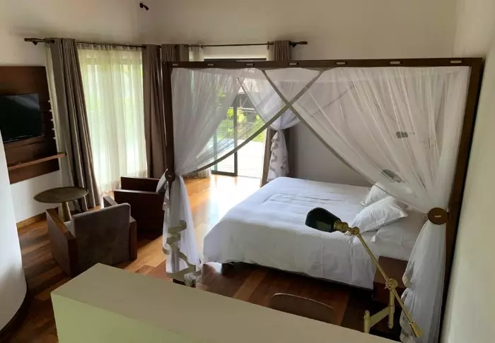 De bungalows zijn echt iets bijzonders! Er is een badkamer met een vrijstaand bad, een eigen balkon met uitzicht op een meer, thee- en koffiefaciliteiten, prachtig katoenen linnengoed, een minibar en wifi (die, zoals gebruikelijk in Madagaskar, wat onstabiel kan zijn). De bungalows hebben twee verdiepingen en bieden plaats aan zowel een bed als een kleine ontspanningsruimte. Ze zijn ingericht in gedempte neutrale kleuren.