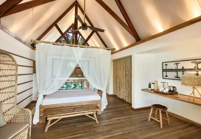 De interieurs zijn stijlvol en ingetogen, met houten vloeren, grote comfortabele bedden onder muskietennetten en mooie accenten van sisal en textiel. In elke bungalow vindt u airconditioning, wifi, een kluisje en een minibar. De lichte, ruime badkamers zijn uitgerust met een douche én verzorgingsproducten.