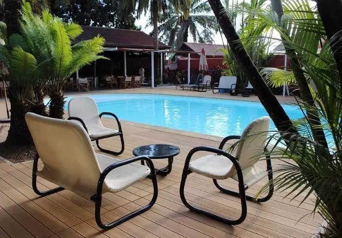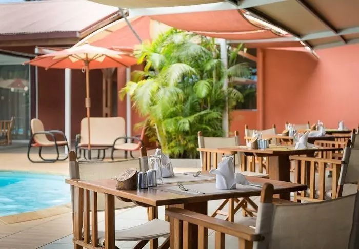 Het hotel heeft een klein zwembadgedeelte met ligstoelen en ook een gezellige bar en restaurant met tafels binnen en buiten.