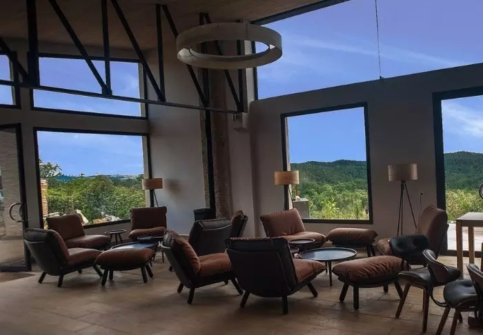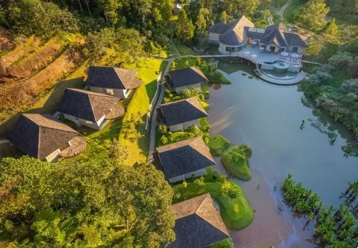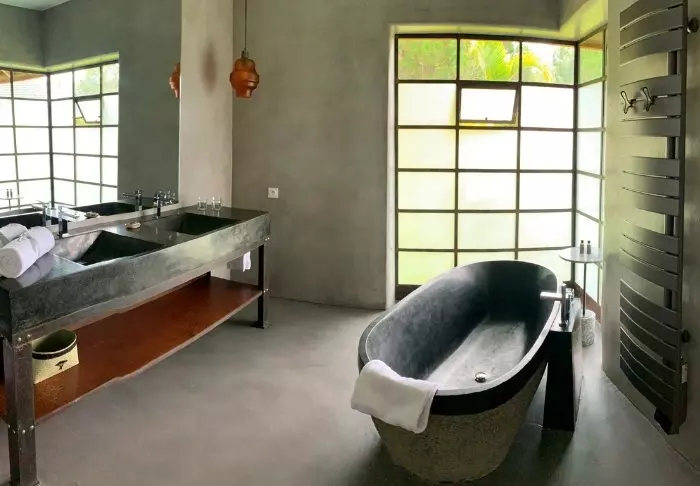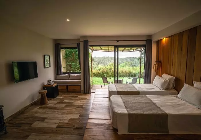 De 23 kamers zijn groot en ingericht met respect voor de omringende natuur. Er zijn houten vloeren en gedempte kleuren, en vanuit de douche heb je uitzicht op het bos om je heen. De badkamers zijn bovendien voorzien van milieuvriendelijke zeep en shampoo, en al het overtollige water wordt verzameld en gefilterd voordat het opnieuw wordt gebruikt om de bloeiende tuin buiten te bewateren.