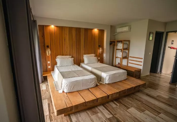 Le Paradisier is een ecolodge in de letterlijke zin van het woord. Het wordt 100% aangedreven door zonne-energie, dus je zult niet veel onnodige elektrische apparaten vinden in de 20 hutten. De hutten, die gebouwd zijn van steen en rieten daken hebben en natuurlijk een werkelijk prachtige rozenhouten vloer, worden gekenmerkt door hun spartaanse inrichting. De bedden zijn comfortabel en voorzien van klamboes, en alle hutten hebben een eigen badkamer en een klein terras aan de voorkant. Er is geen airconditioning (maar wel een kleine ventilator), minibar of Nespresso-apparaat – maar aan de andere kant ligt de zee direct voor je deur. Er is één stopcontact in de badkamer waar je je telefoon kunt opladen, anders is er een oplaadstation bij de receptie.