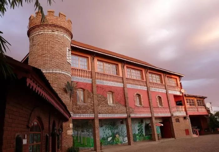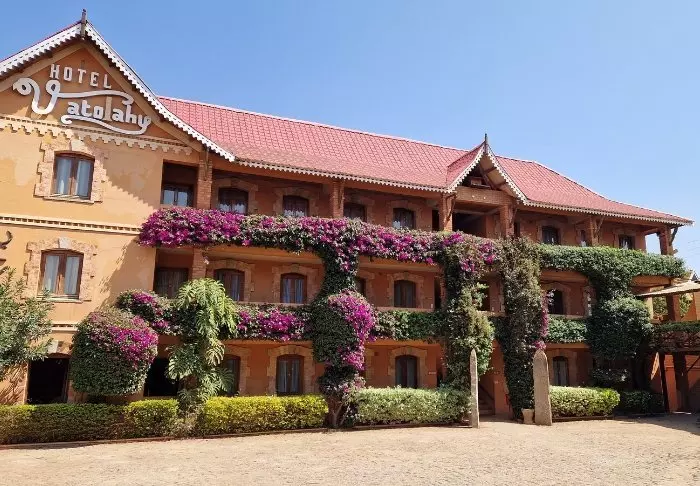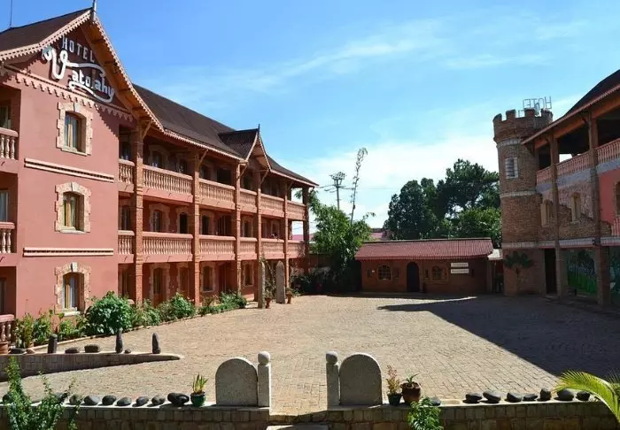 Dicht bij het centrum van Antsirabe vind je Hotel Vatola. Op het eerste gezicht lijkt de architectuur nogal bijzonder – maar dit is de klassieke stijl van het gebied.