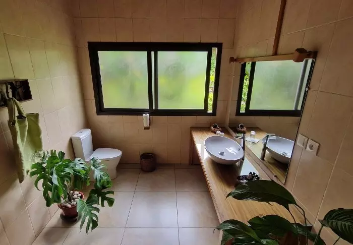 De kamers liggen op een heuvelhelling, omringd door regenwoud, en het interieur is licht en warm – een mix van Scandinavische eenvoud met een vleugje Bali.