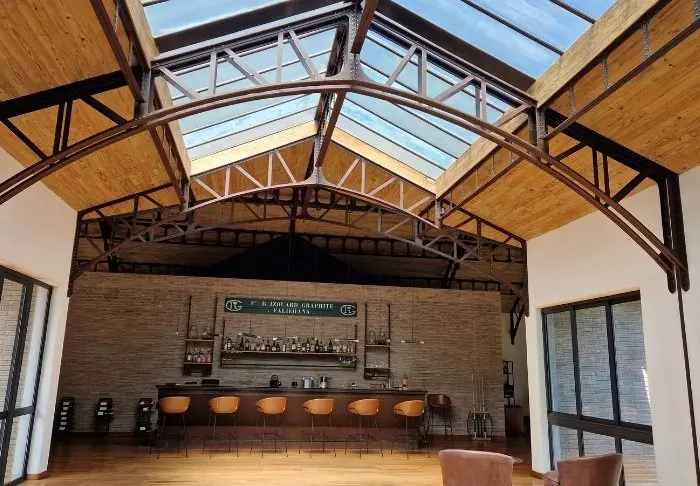 De lodge wordt gekenmerkt door zijn supermoderne en tegelijkertijd ruwe en elegante industriële design met hoge plafonds, een grote open haard in het midden van het restaurant en stalen plafondconstructies. De inspiratie is duidelijk afgeleid uit de grafietmijn en de bijbehorende industrie waar je langs komt op weg naar de lodge.