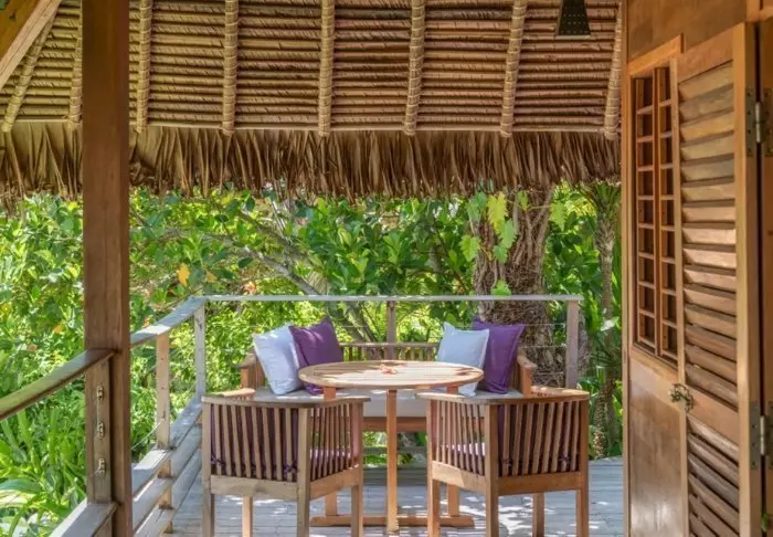 Het resort bestaat uit sfeervolle bungalows van donker hout die verspreid langs het strand liggen, omgeven door bloeiende struiken en klimplanten. Elke bungalow heeft een eigen terras met uitzicht op zee of de tuin – de ideale plek om te ontspannen met een drankje in de hand, bijna met uw voeten in het zand, terwijl de zon ondergaat.