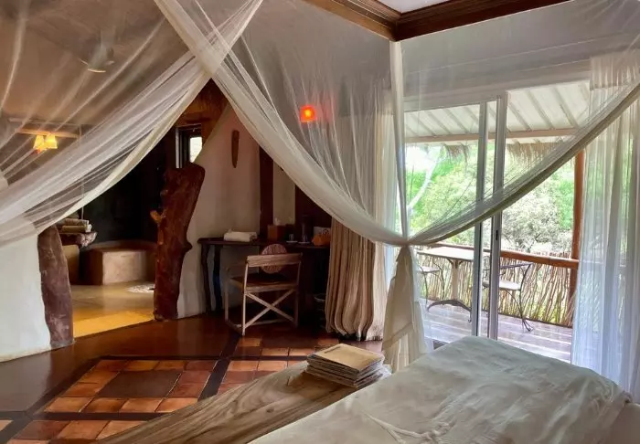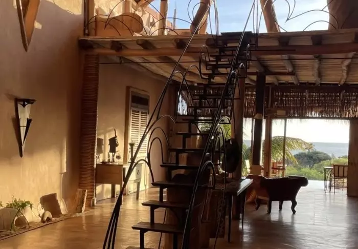 Binnen voel je duidelijk de invloed van het Afrikaanse continent. Bruine tinten, hout en steen domineren, maar op een luxueuze en smaakvolle manier. Alles is prachtig ingericht en het voelt bijna alsof je bij een particuliere kunstverzamelaar op bezoek bent.