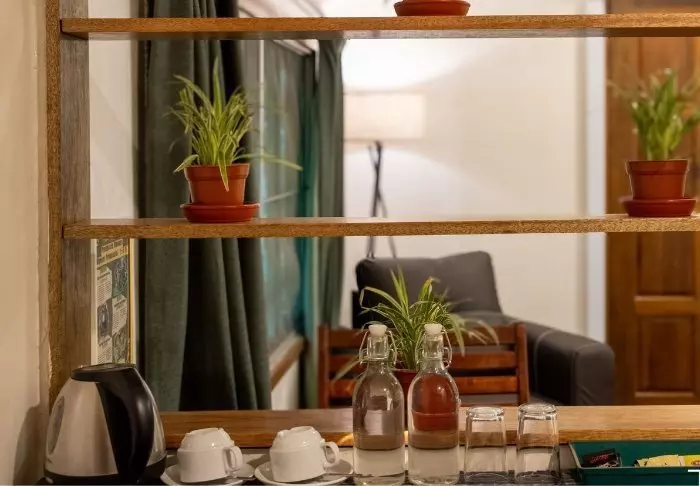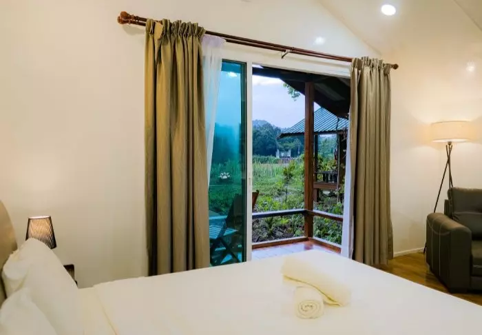 De kamers zijn groot (min. 44,6 m2) en ingericht met houten vloeren en mahoniehouten meubels, die een natuurlijke warmte toevoegen, terwijl verse orchideeën een beetje kleur geven aan de witte, zwarte en grijze tinten. De grote ramen van de kamers nodigen de natuur binnenstromen en bieden een prachtig uitzicht op de groene omgeving. Binnen vind je alles wat je nodig hebt om je thuis te voelen, van zachte bedden tot een comfortabele zithoek met een bank, een tafel en een tv. Andere voorzieningen zijn wifi, thee- en koffiefaciliteiten, gratis flessen water en een kluisje, en ook de badkamers zijn voorzien van een douche, een föhn en essentiële toiletartikelen.