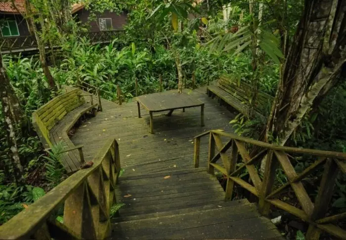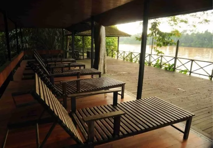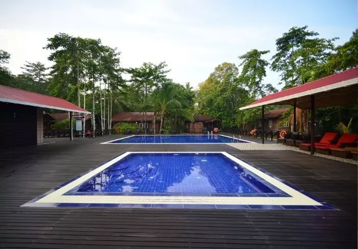 Aan de oever vind je het grote uitkijkplatform van de lodge, dat helder zicht biedt over de uitgestrekte vlaktes langs de Kinabatangan-rivier. Dit is de perfecte plek om de dieren en vogelsoorten van het regenwoud te observeren. Op het ruime houten dek van de lodge wacht een heerlijke zwembadomgeving, met voldoende ruimte voor een verfrissende duik.