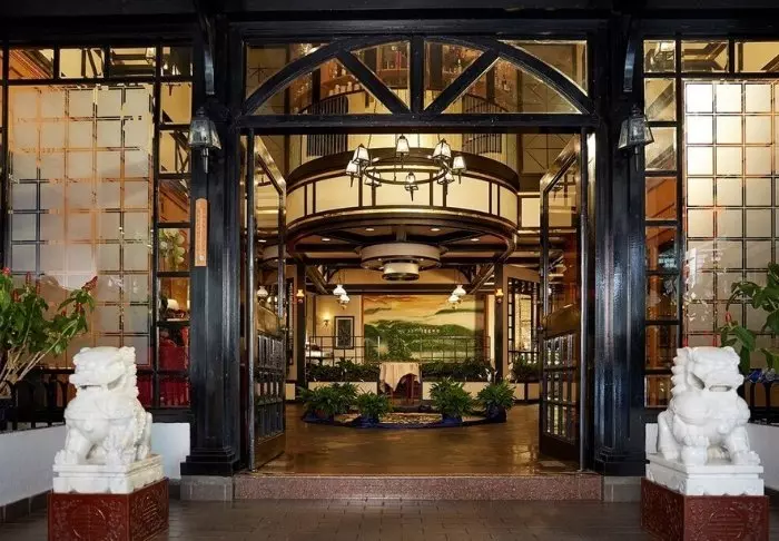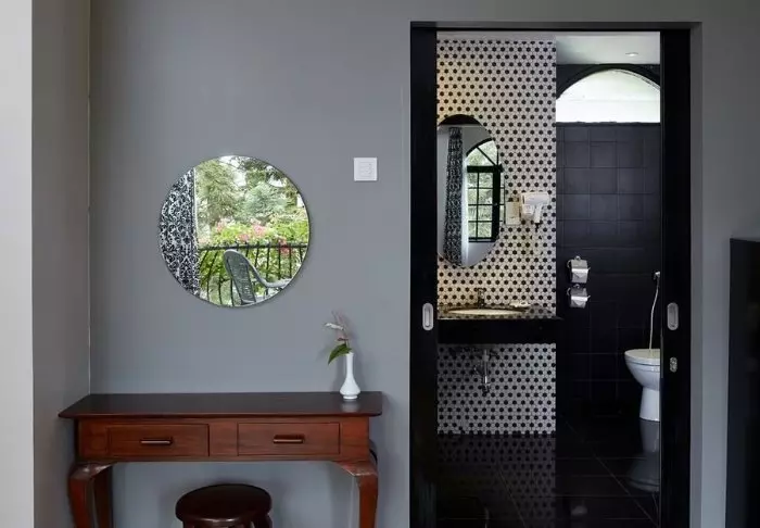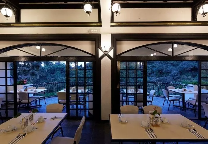 De buitenkant van het resort is in Britse koloniale stijl met witte gevels, zwarte glasramen en mooie balkons versierd met prachtige bloemen uit de omgeving.