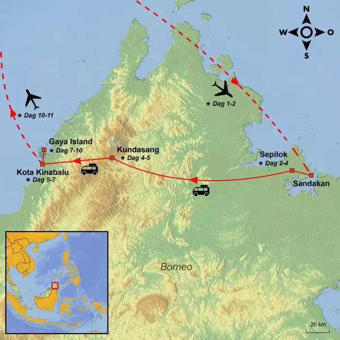 U komt aan in Sandakan, gelegen op Borneo, het op twee na grootste eiland ter wereld. Het zuiden van het eiland hoort grotendeels bij Indonesië, terwijl het kleine Brunei tussen de twee Maleisische deelstaten Sabah en Sarawak in het noorden ligt. Beide regio’s bieden een schat aan spectaculaire ervaringen met natuur en wilde dieren.