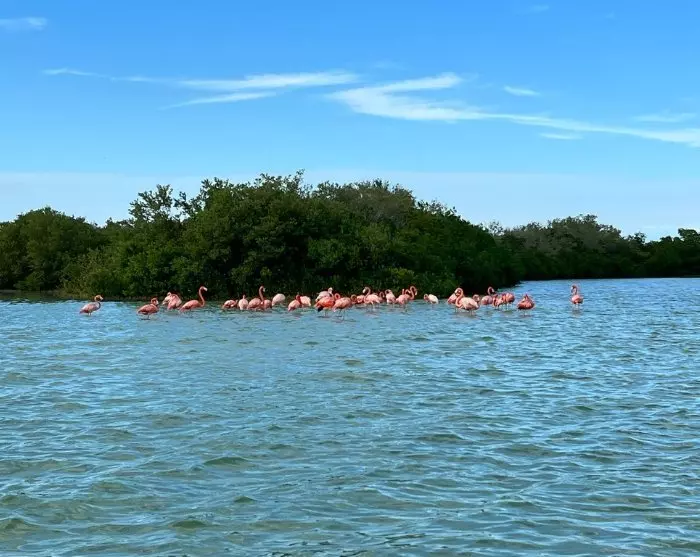 Je wordt ‘s ochtends opgehaald bij je hotel, waarna de eerste stop het vissersdorpje Rio Lagartos is, ongeveer 100 km ten noorden van Valladolid. Hier begint je natuuravontuur met een 2 uur durende boottocht in het biosfeerreservaat met bijna dezelfde naam: Ria Lagartos. Hier kun je je verheugen op het spotten van een schat aan exotische vogels, waaronder de prachtige roze flamingo, terwijl je de mangrovekanalen binnenvaart om de uitgebreide natuurlijke diversiteit te verkennen. De flamingo’s zijn het hele jaar door te zien, maar ze zijn vooral talrijk in de periode van april tot augustus, wanneer ze zich hier verzamelen om te broeden. Misschien heb je ook het geluk om een krokodil te zien die ligt te wachten aan de waterkant.