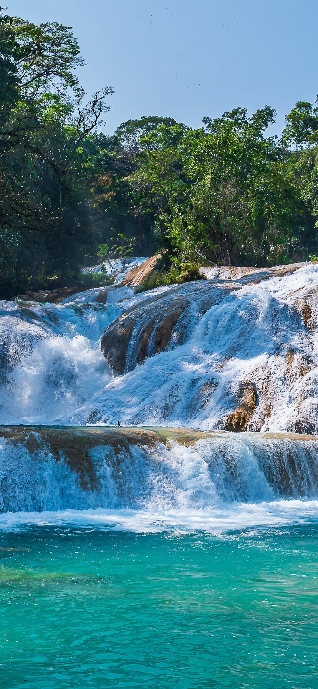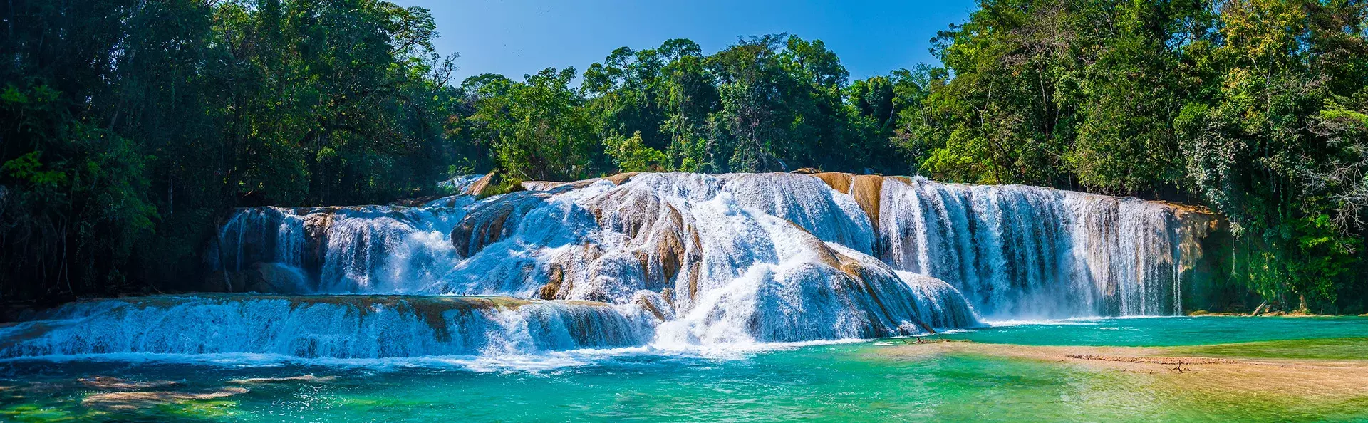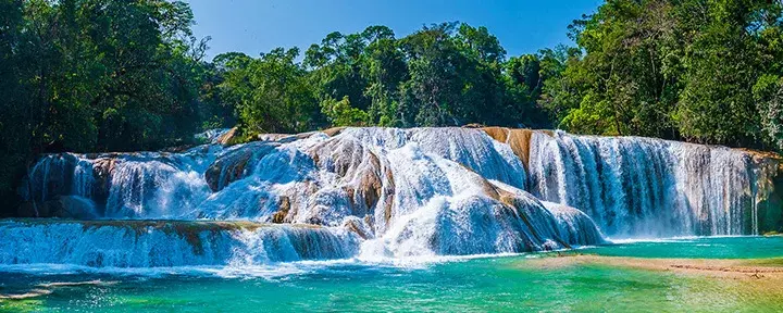 De eerste stop is bij de Agua Azul watervallen (de Blauwe Watervallen), een reeks watervallen waar turquoise water over witte kalkstenen terrassen stroomt in meerdere lagen. De kenmerkende kleur van het water is te danken aan het hoge mineraal- en kalkgehalte dat zonlicht weerkaatst, wat een bijna magisch decor creeërt. De watervallen zijn genesteld in een weelderig regenwoud, waar kleine natuurlijke poelen langs de rivier ontstaan, zodat u een verfrissende duik kunt nemen. De volgende stop is de Misol-Ha-waterval, een enkele val van ongeveer 35 meter die zich dramatisch in een smaragdgroene lagune midden in het regenwoud stort. Er loopt een klein pad achter de waterval, waar u beschut kunt staan van de bulderende stroom en de kracht van de natuur van dichtbij kunt voelen.