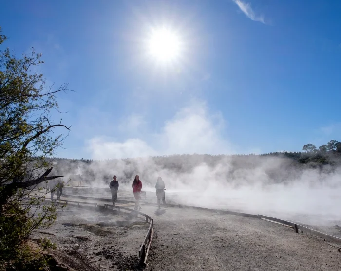 Na aankomst maak je een wandeling op eigen gelegenheid door het park, die ongeveer 1 tot 1,5 uur duurt. Je loopt door een fascinerend landschap van stomende zwavelbronnen, borrelende modderpoelen en kokende watervallen, omringd door de geur van zwavel, warme dampen en gekristalliseerde mineralen. Het pad is duidelijk gemarkeerd en gemakkelijk te volgen. Onderweg vind je informatieborden en uitkijkplatforms waar de bijzondere geologie van het gebied en de betekenis voor de Māori wordt uitgelegd.