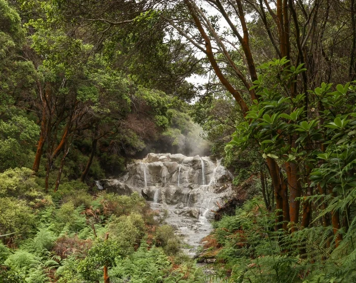 Je passeert plekken met tot de verbeelding sprekende namen als “Inferno Pools”, “Sulphur Crystal Valley” en “Cooking Pool”, waar de temperaturen bijna 100 graden kunnen bereiken. Een absoluut hoogtepunt is de Kakahi Falls – de grootste warme waterval van Nieuw-Zeeland, waar Māori-krijgers zich vroeger na een gevecht genazen.