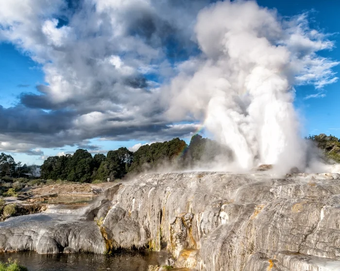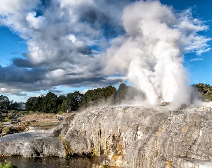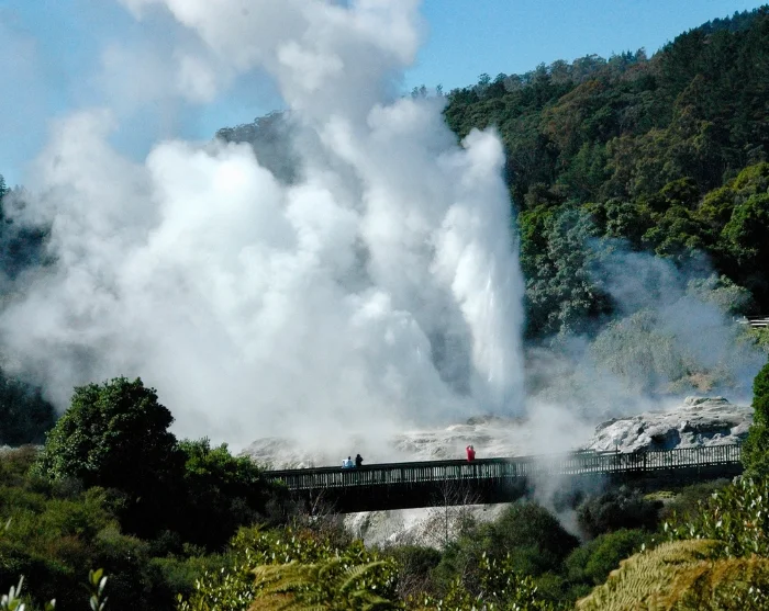 U wordt bij uw hotel in Rotorua opgehaald en de eerste stop van de reis is het Te Puia Thermal Park. Hier ziet u borrelende modderpoelen en spectaculaire geisers, waaronder de beroemde Pōhutu-geiser, die meerdere keren per dag tot wel 30 meter de lucht in spuit.