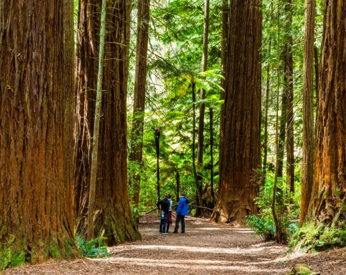 Het Redwood Forest bestaat uit indrukwekkende Californische mammoetbomen (Sequoia sempervirens), die in het begin van de twintigste eeuw als experiment zijn geplant. Inmiddels zijn sommige bomen meer dan 70 meter hoog en al ouder dan een eeuw. Het is werkelijk magisch om tussen deze reuzen te wandelen.
