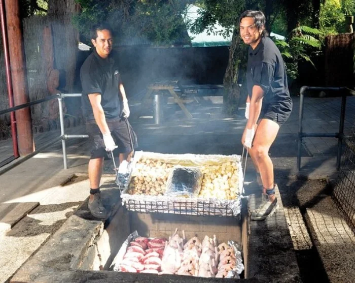 Na het betoverende optreden geniet u van een traditioneel hangi-diner, waarbij mals vlees en verse groenten langzaam worden gegaard in een ondergrondse oven (hāngi) op hete stenen. Het zachte garen geeft de kai (maaltijd) een heerlijke, karakteristieke rokerige smaak. Het diner wordt in buffetvorm geserveerd aan gezellige, lange tafels.