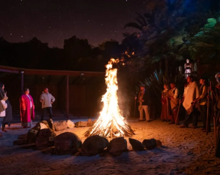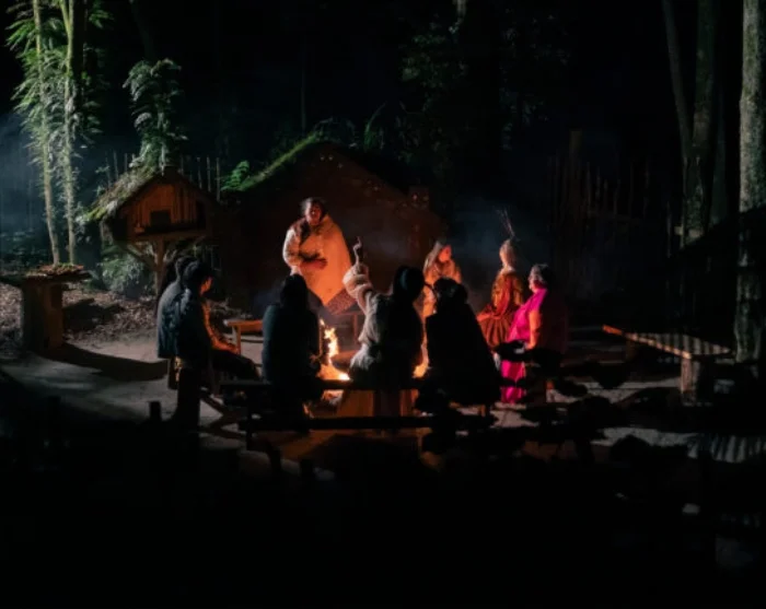In een natuurlijk amfitheater, omringd door hoge tawa-bomen en knisperende kampvuren, geniet u van een levendig kapa haka-optreden. Via de indrukwekkende haka, poi-dansen en waiata (liederen) komen de verhalen en tradities van de Māori tot leven en ontstaat er een diepere band met de culturele wortels van Aotearoa (Nieuw-Zeeland).