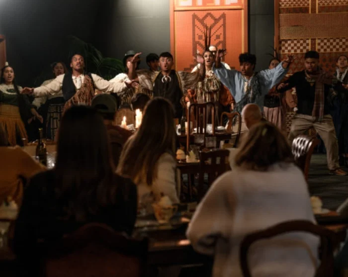 Na de voorstelling wordt u door het bos geleid naar een overheerlijk driegangendiner met Māori-fusiegerechten. Het seizoen bepaalt het menu, met gerechten uit traditionele aardovens (hāngī) en moderne creaties met lokale ingrediënten zoals kawakawa, pikopiko en gerookte specialiteiten. U dineert gezamenlijk aan lange tafels, wat zorgt voor een gezellige sfeer en inspirerende gesprekken.